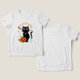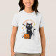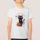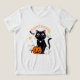 A spooky and eye-catching Halloween-inspired graphic featuring a black cat with glowing eyes, two adorable ghosts, a carved pumpkin (jack-o'-lantern), and twinkling stars.
