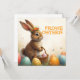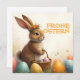 Ein niedlicher Osterhase mit einer Blumenkrone sitzt liebevoll inmitten bunter Ostereier. Em seinen Pfoten hält er ein kleines Weidenkörbchen mit bemalten Eiern. Die Szene ist von zarten Frühlingsblumen und warmem Licht umgeben. Über dem Hasen leuchtet in fröhlichem Orange die Aufschrift "Frohe Ostern"- ein herzlicher Gruß, der die Leichtigkeit und Freude des Frühlingsfestes einfängt.
