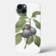 Ilustração de safra botânica com design de fruta com ameixas de jardim roxas maduras (Prunus domestica sp.) num galho de árvores com folhas verdes brilhantes. Uma folha foi consumida por alguns insetos ou insetos. Pelo famoso artista de botânica floral Pierre Joseph Redoute (1759-1840).