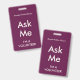 Crachás cor-de-rosa-branca "Pergunte-me" para voluntários, professores, centavos, guias, organizadores de eventos para eventos especiais, tais como casamentos, feiras de artesanatos, shows de casas e jardins, eventos de caridade, funções empresariais e corporativas. A cor da tipografia é marfim pálido que dá a este crachá uma aparência moderna. Fácil de personalizar!