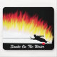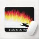 Mousepad com imagem do esquiador da água do slalom que retrocede acima uma parede das chamas em vez da água. Inclui o texto "fumo na água"