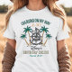 This fun design features colorful modern and script typography with the persons name, age, cruise location and year with hand drawn palm trees and ship anchor illustration. Perfect to wear for a birthday cruise with family or friends.