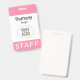 Personalize facilmente este crachá de nome de funcionarios com o logotipo da sua empresa, o nome do funcionário ou outro texto personalizado. É plástico pvc e disponível com um jardim, clipe ou um rolo retrátil. Este é o crachá cor-de-rosa com uma design minimalista moderna de MISOOK. Disponível em outras cores e todas as cores são personalizáveis. Nenhuma quantidade mínima de ordem e nenhuma taxa de configuração.