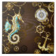 Fundo de madeira castanho com fundo marinho, cordilheira mecânica, volante antigo, âncora de ouro e diversas engrenagens de ouro e latão. Estilo Steampunk.