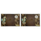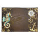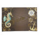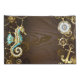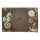 Fundo de madeira castanho com fundo marinho, cordilheira mecânica, volante antigo, âncora de ouro e diversas engrenagens de ouro e latão. Estilo Steampunk.