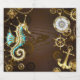 Fundo de madeira castanho com fundo marinho, cordilheira mecânica, volante antigo, âncora de ouro e diversas engrenagens de ouro e latão. Estilo Steampunk.