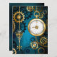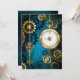 Turquesa, texturizada, fundo steampunk com latão e engrenagens douradas, chave prateada e relógio. Estilo Steampunk.