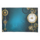 Turquesa, texturizada, fundo steampunk com latão e engrenagens douradas, chave prateada e relógio. Estilo Steampunk.