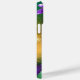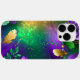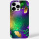 Fundo de grãos de cereais, iridescentes, textualmente, com manchas roxas, amarelas e verdes, decoradas com penas e miçangas brilhantes. feriado Mardi Gras.