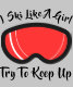 Empowering Quote: Features the funny, confident quote "I Ski Like A Girl Try To Keep Up" in a clear, vibrant print.
