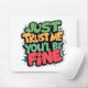 Add a splash of humor and motivation to your desk with this vibrant mouse pad! Featuring the playful phrase “Just Trust Me You’ll Be Fine” in a bold, cartoon-style font with green, yellow, and red accents, this design delivers light-hearted reassurance with a creative twist.