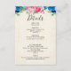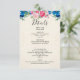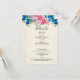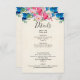 Um cartão de cerimônia de detalhes do casamento com uma borda botânica com rosas e peões cor-de-rosa e pansias azuis. Fundo é uma imagem falsa de pergaminho. Colorida e brilhante. Cheio e verão.