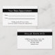 O cartão de médico profissional é duplo. O lado um diz "Seu Próximo Compromisso" e tem linhas para a data e hora do compromisso. Na parte inferior, há texto de exibição que você pode editar para criar uma mensagem personalizada, se desejar. (Mostrado: Tenha gentilmente 24 horas de antecedência se não conseguir manter seu compromisso.) O lado dois tem texto a apresentar para substituir pelo nome do médico (ou nome da prática) e o endereço, número de telefone e sítio Web. Todo o texto pode ser editado ou excluído. O texto é preto.