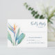 O cartão de resposta de casamento tropical chic apresenta uma borda lateral de florais aquosos com folhagem botânica e verde-limpas. Personalize com seus detalhes de rsvp no moderno script escrito à mão e nas letras sans serif tradicionais. Placa de resposta inversa para cor verde-azul-marinho rica. Perfeito para jardim, verão, destino ou casamentos de praia. Para ver mais designs como este, visite www.zazzle.com/vginvites