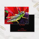 Este Cartão de Comércio de Artista, brilhante e colorido, apresenta um gafanhoto verde, amarelo e preto, pregado no centro roxo de uma flor com pétalas vermelhas lindas.