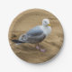 Uma fotografia de uma gaivota numa praia arenosa impressa numa placa de papel.