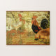 Trabalho de arte de colheita num quebra-cabeça com galos e galinhas.