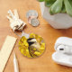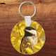 Aqui está um chaveiro floral que apresenta um adorável grão-de-bico preto e branco entre as flores douradas e amarelas da forítia. Este pequeno pássaro é uma das criaturas mais amigáveis do reino animal. Uma ideia de excelente para jardineiros ou passarinhos!