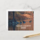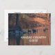 Gansos canadenses fotografados de perto com o pôr do sol brilhando na água, com árvores e rochas à beira do lago. Isso está em um CARTÃO POSTAL.