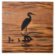 Este azulejo das belas artes apresenta uma garça-real de grande azul (herodias do ardea) na silhueta, pescando nas águas rasas do lago Cayuga em Ithaca, NY que é um dos lagos finger do norte do estado de New York. Um por do sol bonito alaranjado, amarelo e do ouro colore as ondas e as ondinhas em um teste padrão abstrato.
