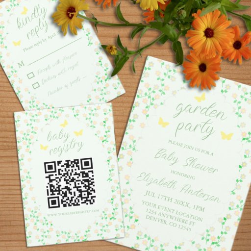 Garden party baby shower with a gender neutral light green shade and yellow butterflies