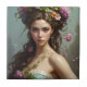 Imagem gerada pela IA de uma mulher adornada com uma coroa de flores vibrantes e coloridas, colocada contra um pano de fundo sereno e etéreo.