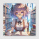 Menina de Anime com olhos roxos em Óculos na Biblioteca lendo livros em um vestido bonito com fones de ouvido de orelhas de gato.