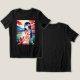 T-shirt num retrato de uma jovem serena no trajado tradicional japonês, que segurava um gato branco no meio de uma paisagem tranquila, com matizes vibrantes, vermelhas e azuis pastéis, a criar um fundo harmonioso. A cena apresenta montanhas distantes, árvores floridas e um lago.