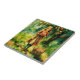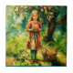 Azulejo cerâmico em um retrato ao estilo aquarela de uma jovem garota com um vestido vermelho em um pomar, segurando um cesto de maçãs. Ao redor dela estão maçãs maduras no chão e penduradas em árvores. A cena evoca calor, inocência e a beleza da natureza.