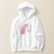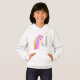 O Hoodie da Rapariga Personalizada do Rainbow Unicórn Flowers para meninas foi projetado com um toque de estilo de vidro. O suéter encapuzado é branco e tem uma face bonito de unicórnio branco no centro e tem cabelo arco-íris com flores no topo da cabeça. Personalizado com nome no lado vertical do script de caligrafia de cinza.