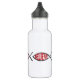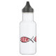 Três símbolos cristãos de peixe com a palavra "BELIEVE" no centro decoram esta garrafa de água.
