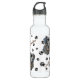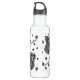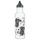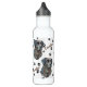 Esta garrafa d'água apresenta o retrato de um artista de um lindo cachorro preto Labrador Retriever. A imagem é repetida em torno do perímetro da garrafa e colocada sobre um fundo aspergido com estampas pretas. Seu nome ou outro texto em castanho também se repete em volta do perímetro.