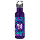 Bonito padrão elegante de flores roxas, azuis, lacas, tartarugas e verdes e garrafa de água personalizada folhagem.
