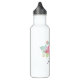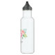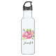 Uma garrafa de água personalizada com uma bela e elegante coloração d'água criada a buquê floral. Flores cor-de-rosa cercadas por folhagem verde-clara.