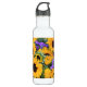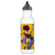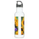 Os girassóis dourados são ajustados fora por roxos e por verdes para criar uma garrafa de água bonita e alegre!