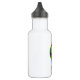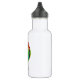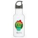 Uma garrafa de água personalizada com uma ilustração fofinha de um cacto redondo, com grandes olhos kawaii, sorrindo e vestindo um sombrero vermelho. Dentro de um pote de flores.