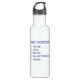 O gráfico nesta garrafa de água engraçada é ao estilo de um formulário do governo com caixas de verificação. O texto azul lê "maio contem" e caixas de verificação das características ao lado da água, do suco, das bebidas, de todo o acima e de outro.