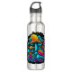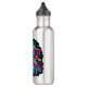 Arte neon colorida com cogumelos e flores azuis e cor-de-rosa e um fundo preto.
