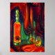 Uma garrafa de uísque e dois copos em uma mesa no estilo de Edvard Munch. Esta é uma arte gerada por IA.