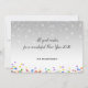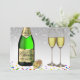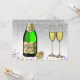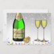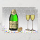 Saudações ao feliz ano novo escritas em uma garrafa espumante, este texto é totalmente personalizável. O número do ano é apresentado na rolha junto aos vidros espumantes. Confete festivo e colorido no chão e belo boque elegante no fundo.