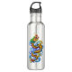 Esta garrafa de água de aço tem um dragão colorido e detalhado nas máscaras do ouro, do verde, de vermelho e azul e é cercada perto espirra da água azul.