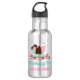 Uma garrafa d'água com um ditado engraçado, trabalhando até o sorvete. Tema do sorvete Asweet. Ilustrado com um bar de sorvete de chocolate, sundae de 3 colheres com uma cereja no topo, e um float de morango com chantilly. Pequenos morangos e cerejas ao longo do fundo.