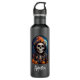 Garrafa de água com ilustração de um esqueleto vestindo uma jaqueta encapuzada com um chapéu de bruxa laranja em cima. Cercado por abóboras giras e assustadoras. Uma lua brilhando nas costas com um morcego solteiro voando perto. Design de Halloween de outono divertido.