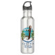 Esqui, logotipo de poster de esqui em uma linda paisagem de desenho animado.