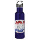 Uma garrafa de aço inoxidável patriótica apresenta arte "EUA" com texto vermelho, branco e prateado, e acrescentou estrelas cintilantes vermelhas.