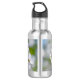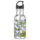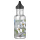 Flor de cereja branca contra fundo multicolorido turvo. Bela época de primavera. Espuma branca e verde de um jardim em floração de cheio. Impressões e presentes para diversão e bom humor. Garrafa de água para qualquer pessoa
