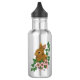 Um coelho marrom giro fica entre as flores cor-de-rosa contra o pano de fundo azul claro
