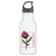 Uma garrafa de água com o seu nome personalizado, dentro de uma estrutura branca de casca de ovo, com uma borda rosa. Seu nome está escrito em uma fonte de script de rico. Com uma ilustração de uma flor silvestre rosa bonito com caules e folhas verdes longos.