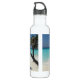 Garrafa de água com uma bela e serena fotografia. Águas turquesas tropicais azuis, com uma praia branca arenosa. Uma árvore tropical solo proporciona um bom lugar para relaxar e desfrutar desse lugar idílico cênico.