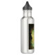 Garrafa d'água com a imagem de um paraíso oceânico. Uma entrada de caverna rochosa nas montanhas, olhando para um belo oceano com pássaros voando juntos.